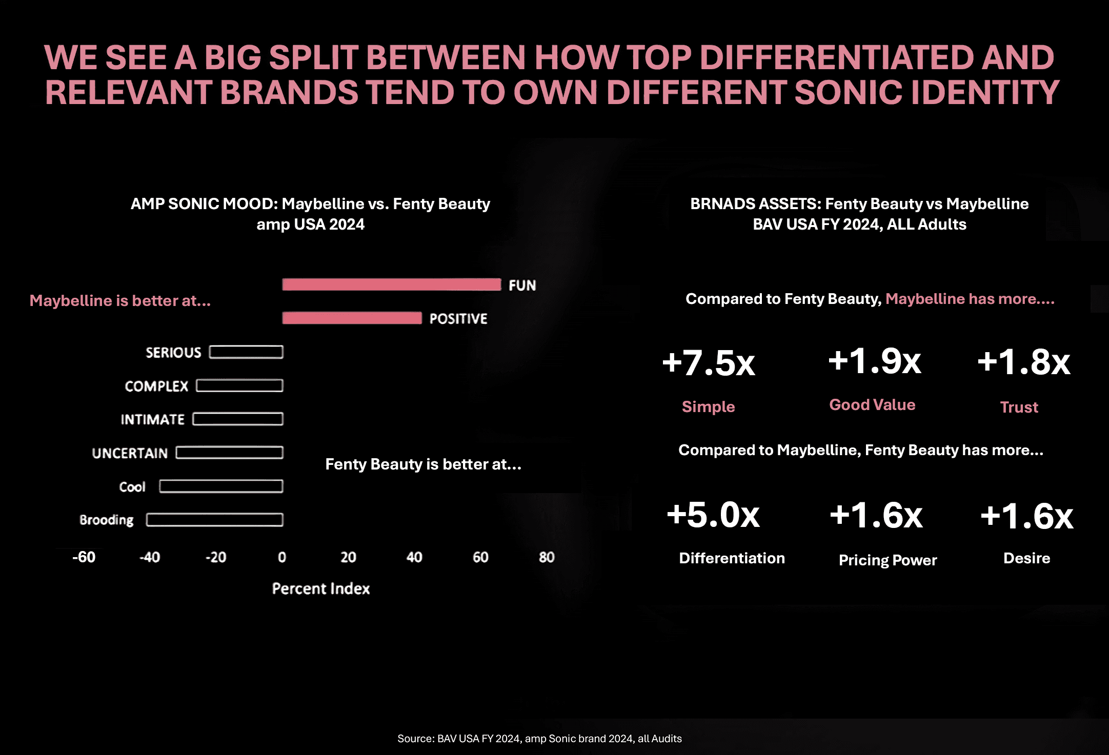 Health and Beauty brands typically cluster in approachable, energizing territory where Fun and Positive moods drive relevance and advocacy. Fenty Beauty stands out by stepping beyond these category norms. Its sonic presence is calmer, more dramatic, and a touch more open-ended than peers, and that deviation correlates with a clear edge in differentiation.